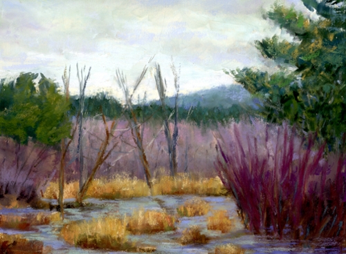 Change of Color is a soft pastel painting I actually did in my car! It was a lovely, drizzly early spring day and I was in one of my favorite locations for plein air. There is a swamp just off of Rt. 63 heading into Amherst that for years caught my eye on my morning commute. I have painted this area in the autumn but this was my first venture painting it in spring . The colors are subtle and delightful. The textures varied and yet, because of the drizzle, everything looked soft.