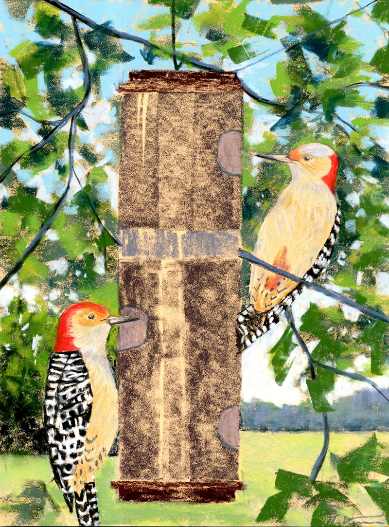 I painted this pastel standing under the canopy of a maple tree and five feet away from our bird feeder. I love painting outdoors and have recently added painting birds and other wildlife live to my repertoire. It is such a joy to do and great for my growth as an artist. I choose colors and make my marks with greater spontaneity and with less analysis. The results produce fresher, more living, paintings.